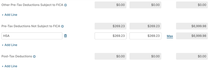- Pre-tax Deductions - For example, Pre-Tax Savings Deferrals, Pre-Tax Deductions Subject to FICA, and Pre-Tax Deductions Not Subject to FICA can be entered here.