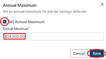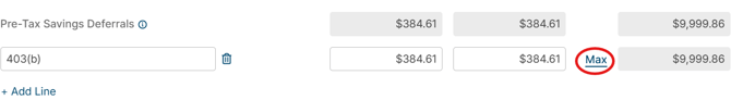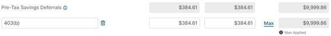 - For applicable categories (e.g., Pre Tax Savings Deferrals), click Max to set a maximum annual limit to avoid projecting amounts that exceed legal limits. Then, check the Set Annual Maximum box, and enter the limit at which you want Holistiplan to stop that deduction from being made to wage income, before clicking Save. Once a max has been set, the Max Applied indicator will show.