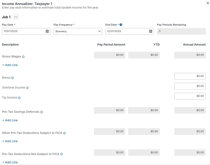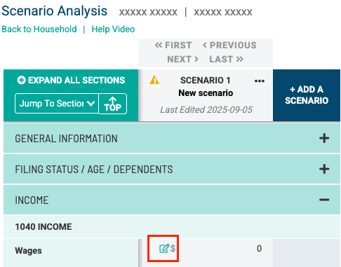 The Income Annualizer is a tool within Scenario Analysis that helps you project annual amounts for wage income items, payroll deductions (pre-tax and post-tax), and federal and state tax withholdings based on information from a client’s paystub.