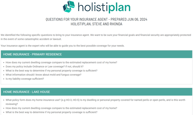 Holistiplan's Insurance Review allows users to summarize their clients' home, auto, landlord, and umbrella insurance policies in a single document, including premium and coverage information and insights related to that coverage. To turn that summary into action, users can create an Insurance Agent Letter that clients can bring to their insurance agents to discuss the most important questions stemming from the review.