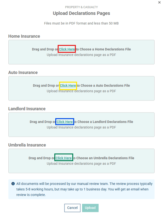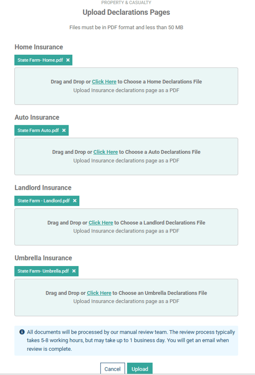 You will either drag and drop or utilize the “Click Here” links on each of the home, auto, and umbrella sections to upload multiple policies’ declarations pages all at once. Once a policy is successfully attached, you will see the bubble for that document show up under as seen below. When you have finished selecting the appropriate files to upload, click the “Upload” button at the bottom of the pop-up window to upload all your insurance documents to Holistiplan.