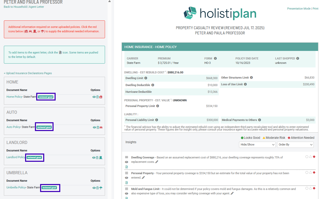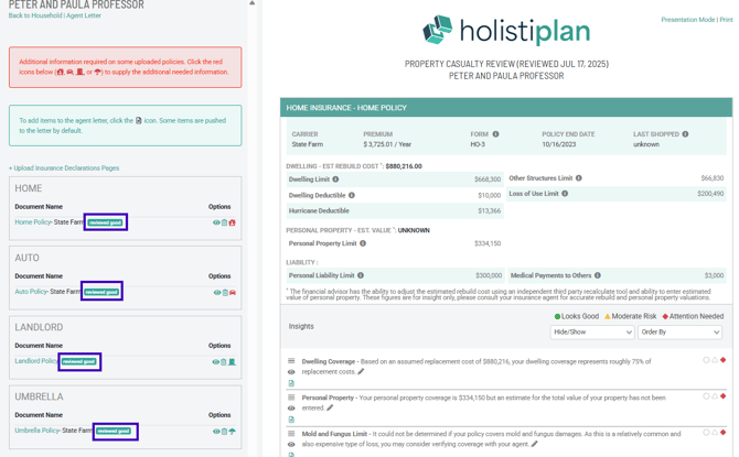 Once the reading of the document is completed, you will see a tag indicating the document upload status as “reviewed good,” as seen below. While an uploaded policy document is being reviewed, you will see the “hold for review” status. If an upload is unsuccessful, you will receive an email from Holistiplan explaining the issues with the uploaded document and see a “reviewed bad” status on the Insurance Review. If an advisor updates a policy by adding policy details (See Policy Controls below), you will see an "advisor updated" status.