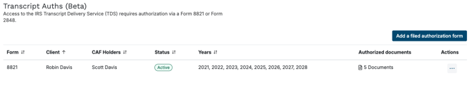 - Click the Add a filed authorization form button in the top right corner of the table to log a POA form that is on file with the IRS.