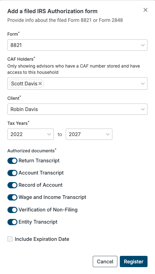 - Click Register to record the POA. It will now appear in the household's Transcript Auths table.