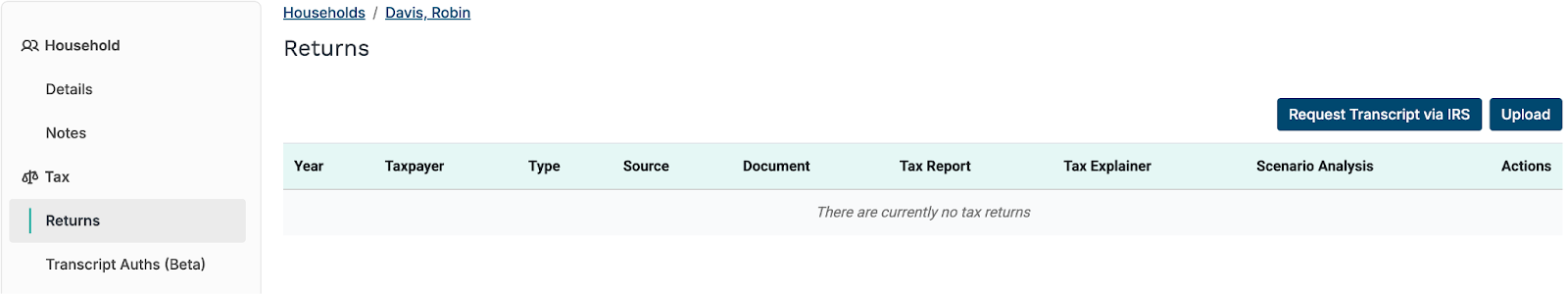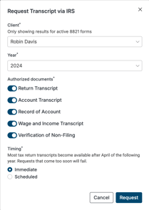 - Click Request Transcript via IRS in the top right corner of the Returns table to initiate a transcript request.