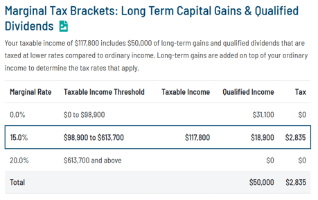 However, that total income and AGI of $150,000 is further reduced by (in this case), the standard deduction of $32,200 (Line 12), to arrive at taxable income of $117,800. Of that $117,800, only $67,800 is taxed at the marginal rate, and the remaining $50,000 is taxed at the long-term capital gains rates. Here is what that would look like on the Tax Report: