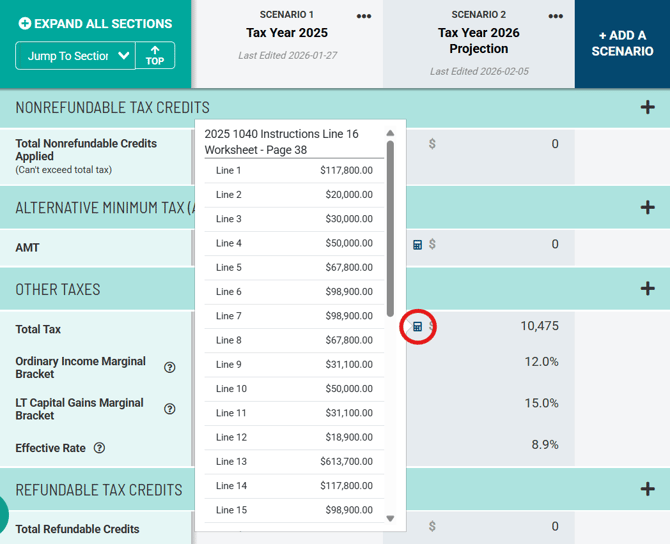 Although qualified income is part of taxable income, it isn't until the tax calculation from line 16 of the 1040 that qualified income is backed out. The qualified income is taxed at the more favorable long-term capital gains rate, and the remaining ordinary income is then taxed at the marginal tax bracket corresponding to that remaining ordinary income. The instructions for Line 16 on page 37 of the 1040 Instructions from the IRS can be seen for this total tax calculation within Scenario Analysis by clicking on the calculator icon circled below next to the total tax line.
