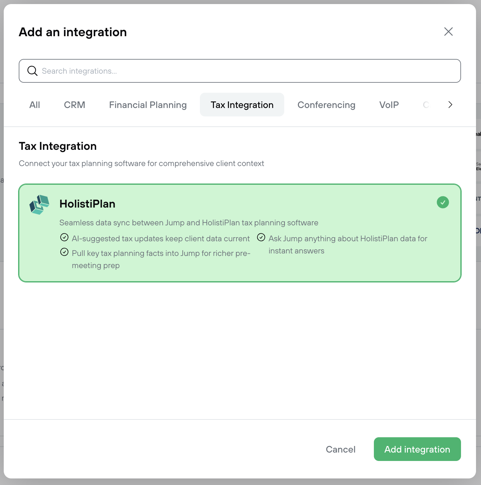 Integrating your Holistiplan account with Jump brings real-time portfolio and tax context into Pre-Meeting Prep, so advisors can see balances, allocations, contributions, and recent activity without leaving Jump.