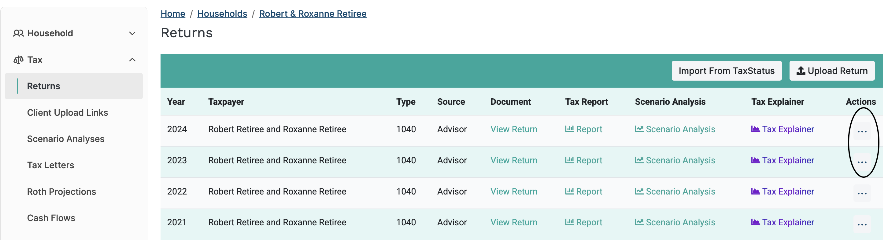 You'll accomplish this by first heading to your client's household page. Then, you'll need to click the small ellipses (...) to the right of the upload under the heading Tax > Returns section.