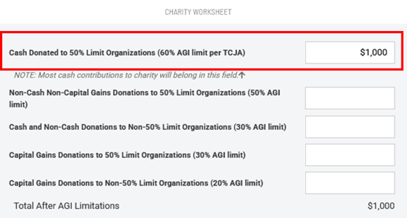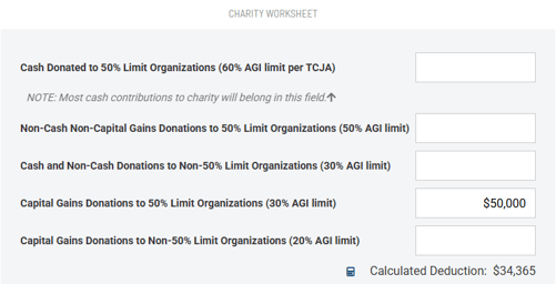 In the example above, 30% of the taxpayer's AGI came out to $34,365, which was the limit of their charitable deduction. The taxpayer can use the $15,635 charitable carryforward in the next tax year.