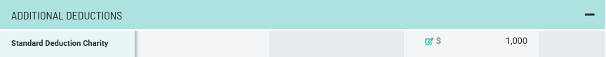 Starting in 2026, taxpayers who take the standard deduction can still take a charitable gifting deduction. To model this, follow the same procedure as outlined above (even though the taxpayer is going to take the standard deduction). Only use the top row of the Charity Worksheet, as this deduction is only available for cash gifts. Holistiplan will detect that the taxpayer is taking the standard deduction and generate the charitable deduction for non-itemizers in the Additional Deductions Section.