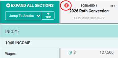 In Scenario Analysis, users can create a baseline and change subsequent scenarios to model how a Roth conversion would affect a client. This is the most precise way to model the tax impact of a Roth conversion.