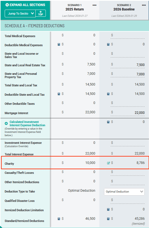For example, Peter and Paula made a $10,000 charitable contribution in 2025, as shown below in Scenario 1. When copying the return, this charitable contribution copies into the new scenario, which is our baseline for 2026. (Note that due to the new 0.5% AGI charitable floor limitation for itemizers, their calculated charitable deduction is $8,786). If they are donating a different amount, or not at all, this would require an update in the Charity Worksheet.