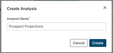 On the individual client's household page, scroll to the Scenario Analyses section on the left navigation menu outlined below. Then, click Create Analysis and title the scenario (e.g., "Prospect Projections" as seen in the example below).