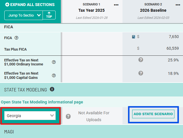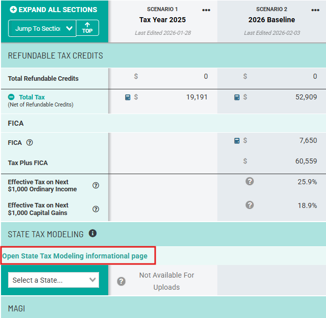 After a Firm Admin has enabled the state tax modeling feature, users will see a new section in Scenario Analysis right after the "Refundable Tax Credits" section and just before the "MAGI" section.