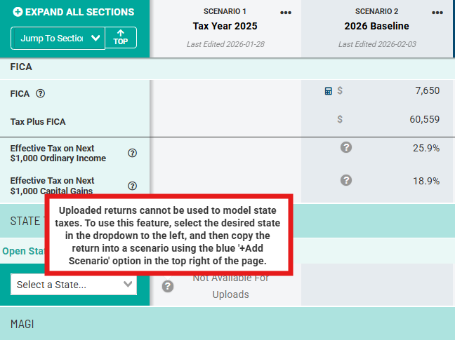 As a reminder, Holistiplan does not read in state tax returns. Accordingly, the state tax section for any scenario reflecting an uploaded return will be blank, as there is no information to populate that section. Users will see language indicating that state tax modeling is not available for uploads, along with a corresponding tool tip.