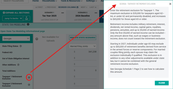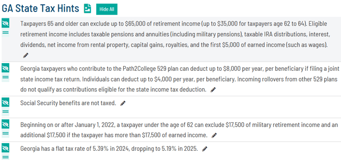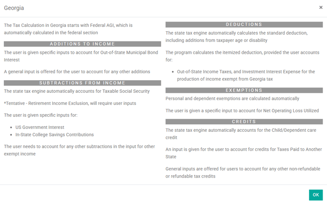 It may be helpful to review information on various states by clicking the "Open State Tax Modeling informational page" link below, which will list all states and an outline of the flow of each state's tax calculation. Georgia's page is shown below as an example.