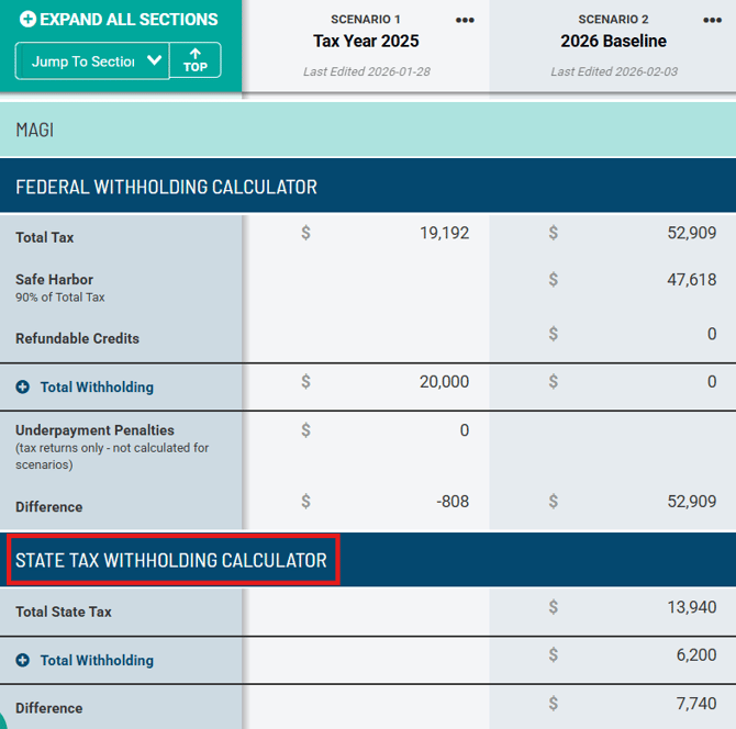 If the State Tax Modeling section is enabled, the Withholding section will include a "State Tax Withholding Calculator" beneath the existing "Federal Tax Withholding Calculator". State withholding will be greyed out for the scenario with the read-in return; however, in editable scenarios where a state scenario has been added, users can enter any state tax withholding information.