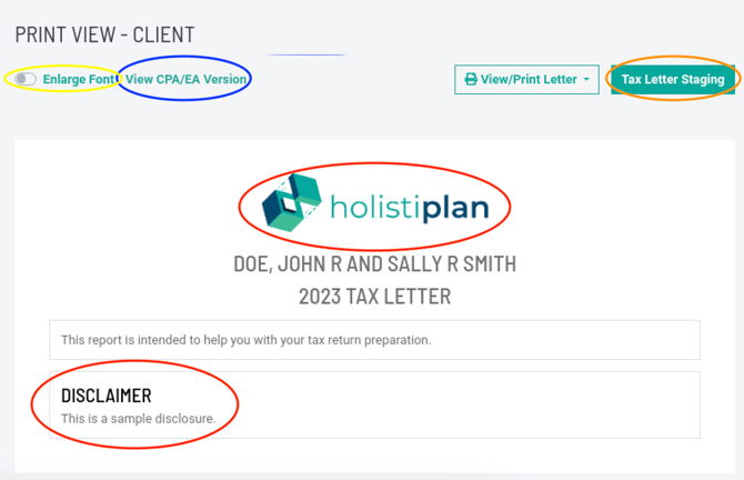 - Enlarge Font (circled in yellow) using the toggle button to increase the text size on the tax letter.