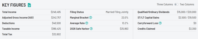 Click here to review the article discussing Filing Status, Marginal Rate, Average Rate/Effective Rate, Safe Harbor, and Tax Exempt Percentage of Income (if applicable) key figures.