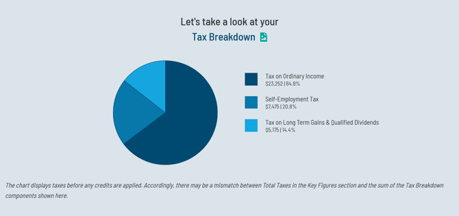 The Tax Breakdown is a pie chart that displays the client's total tax breakdown. That chart is broken down into the income tax on the two forms of taxable income - ordinary income and qualified income [long-term capital gains (LTCG) and qualified dividends] - as well as other taxes like Self-Employment Tax, the Net Investment Income Tax (NIIT), and Additional Medicare Tax.