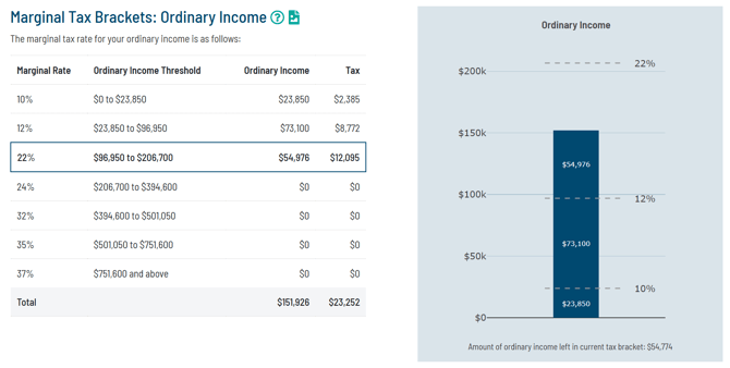 This section also includes a bar chart for easier visualization of how each bracket is filled. It shows how much room the taxpayer has in their current bracket. See the tax associated with each bracket by hovering over the amount of income in that bracket.