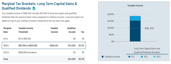 In addition to indicating marginal rates and corresponding income brackets for ordinary income, this panel also includes the amount of ordinary income taxed within each bracket and the corresponding tax on that income. Total ordinary income and tax on ordinary income is provided at the bottom of the table.