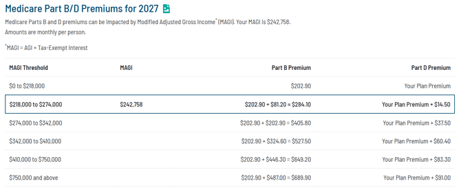 Because Medicare Premiums use a 2-year lookback, the Tax Report's Medicare section shows the impact of income on a taxpayer's Medicare Part B and D Premiums two years after the year of the tax return. This section estimates whether the taxpayer will be subject to Income Related Monthly Adjustment Amount (IRMAA) surcharges in the future based on current income and displays the total premium, including the base amounts and any surcharges.
