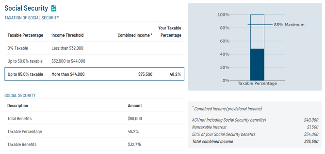 For taxpayers with Social Security benefits, this panel breaks down total and taxable benefits, the taxable percentage, as well as "Combined Income" (i.e., Provision Income) used to determine the taxable portion.