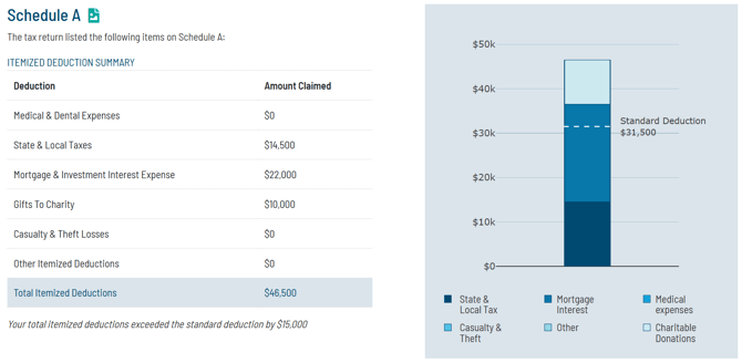 If the tax return includes Schedule A, the Tax Report will include a breakdown of the itemized deductions noted on that Schedule. Additionally, a graphical representation of those itemized deductions, including a demarcation where the standard deduction would otherwise occur. This can help advisors show clients how much of their itemized deduction was truly deductible relative to having just claimed the standard deduction.