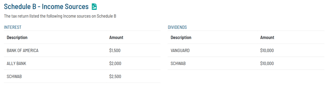 If Schedule B is included with the uploaded tax return, the Tax Report will show a summary of the interest and ordinary dividend sources and amounts.