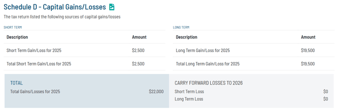 If Schedule D is included with the uploaded tax return, the Tax Report will include a summary of short and long-term capital gains. In addition to being called out in the Key Figures section, if present, any carryforward losses (or $0 if none) are highlighted as well. While not included in the sample, if Schedule D includes any Section 1250 Depreciation Recapture of 28% Tax, we'll note those items in the Schedule D section, along with notes on how those two subsets of long-term gains are taxed.