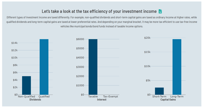 A graphical section dedicated to illustrating the tax efficiency of investment income on the return. Here, users can see what portion of the clients' Ordinary (total) Dividends are qualified and therefore eligible for taxation at the more favorable long-term capital gain rates. Users can also have a quick look at the amount of taxable vs. tax-exempt interest and how much of the net capital gains are short-term (and taxed at ordinary income rates) vs. long-term (and taxed at the more favorable long-term capital gains rates).