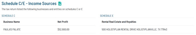If Schedule C and/or Schedule E is included with the uploaded tax return, the Tax Report will include a summary to include Schedule C business names and net profit and Schedule E entity names (properties, businesses, trusts/estates). Because of the various classes of income on Schedule E, the net income for those entities is not currently pulled into the Tax Report.