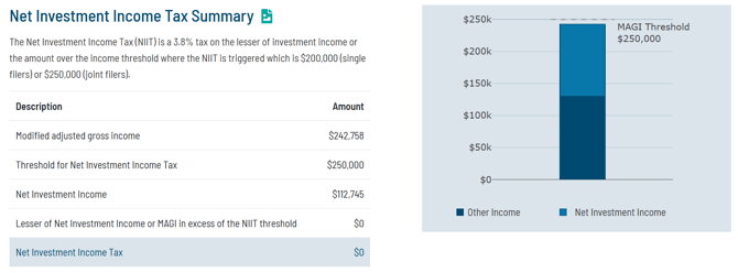 For taxpayers subject to Net Investment Income Tax (NIIT), the Tax Report will lay out how NIIT is assessed.