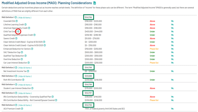 You can click on the (?) icon shown circled in red above to learn more about each planning opportunity and see the actual dollar amount of the MAGI calculated for each, outlined in green.