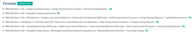 The six definitions are included below the MAGI planning considerations. Users can click the eye icon to hide specific MAGI calculations or the teal "Hide All Formulas" button to hide them all.