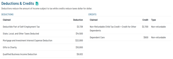 In addition to the itemized deductions in the Schedule A section noted above, the Deductions & Credits section includes all deductions, both on Schedule A and on Schedule 1. This also lists out the specific credits included on the return, adding color to the total credits claimed number included in the Key Figures section.