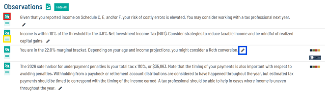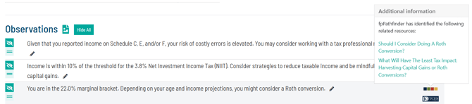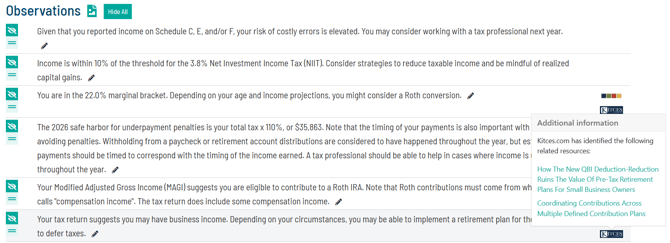 Holistiplan generates observations for a tax return based on income amounts, tax amounts, marginal rates, inclusion of certain schedules, and income types. The observations are specific to the return in question.