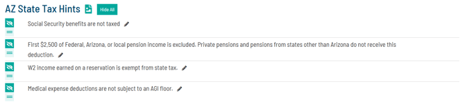 While optional, if the client’s state of residence is indicated in their household page, the report will generate a list of hints specific to the tax code for that state.
