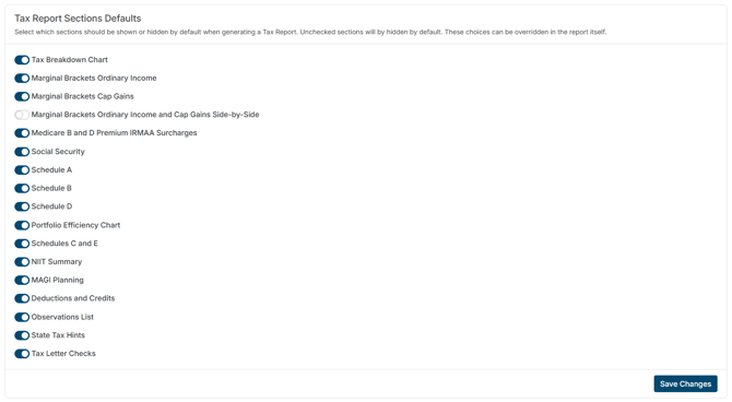 It also includes selecting which sections will be visible by default on the Tax Report when the tax return includes their respective schedules.