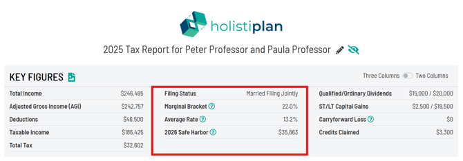 Tax Report: Key Figures - Filing Status, Marginal Rate, Average/Effective Rate, Safe Harbor, Tax-Exempt Income