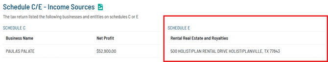 This table notes the sources for any rental, royalty, partnership or S-corporation income, though it does not include the amount. Peter and Paula have a Schedule E for their rental property on 500 Holistiplan Rental Drive.