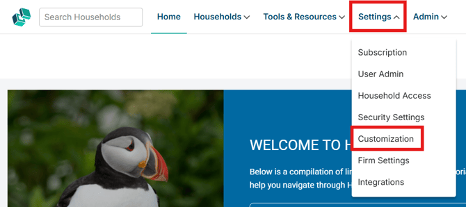 To edit the Tax Report default sections, Firm Admins can navigate to Settings > Customization, scroll down the page, and select the third Tax Report tab in the menu: