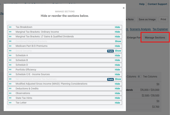 Users will still be able to show and/or hide sections as they see fit by clicking on the Manage Sections button at the top of the Tax Report, but the default layout set at the firm-level is how all Tax Reports will look upon first visit.