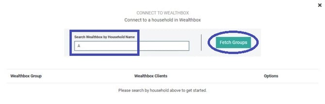 NOTE: Depending on how your Wealthbox households are named, you may not be able to find the household you are looking for. You can "Fetch Groups" after only typing one letter in the box above, so try typing in fewer letters and searching if you are having difficulty locating households.