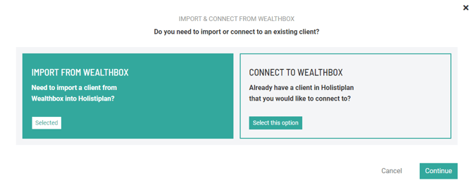 NOTE: Depending on how your Wealthbox clients are named, you may not be able to find the clients you are looking for. You can "Fetch Clients" after only typing one letter in the box above, so try typing in fewer letters and searching if you are having difficulty locating clients. - Connect to Wealthbox - This function allows you to connect clients already saved in Holistiplan with existing client/contact records in Wealthbox from which you would like to pull that data from Wealthbox over to Holistiplan to update the client information.