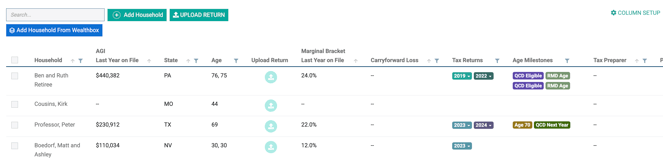 • Upload Return (button to upload a return into a specific household vs. clicking the "Upload Return" button at the top of the Household screen and then selecting the household)