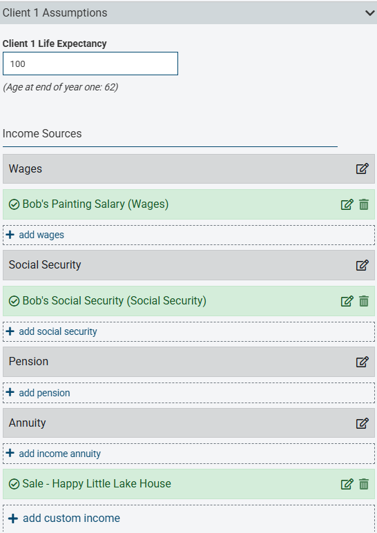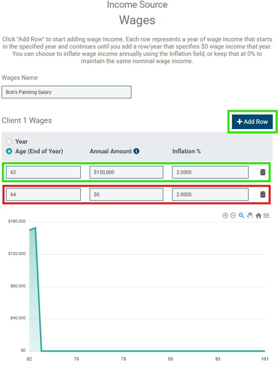 In the example below, we have added $150,000 of Wage Income for Client 1 to reflect Bob's painting salary for two years, beginning at age 62, increasing by 2.0% per year, and ending at age 64, when he retires.