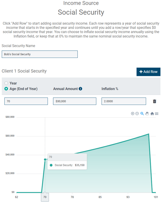 Income items are entered in today's dollars (present value), so income start/stop years or ages in the future will be inflated based on the inflation assumption entered. In the example below, we are projecting $30,000 in today's dollars to begin at this client's age 70. Since this client is currently age 62, $30,000 at age 70, inflated at 2% per year, means the $30,000 we enter will really be $35,150 at his age 70. We do not indicate a $0 row to end this cash flow, so it continues indefinitely until the end of life expectancy (age 100 here).